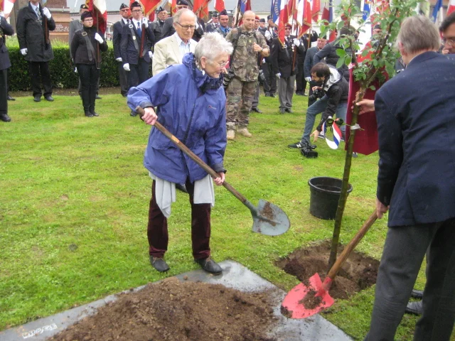 Peggy Seeger, niece of American poet and Foreign Legionnaire Alan Seeger who died during the battle of Belloy-en-Santerre, plants an apple tree in commemoration of all those killed 100 years earlier